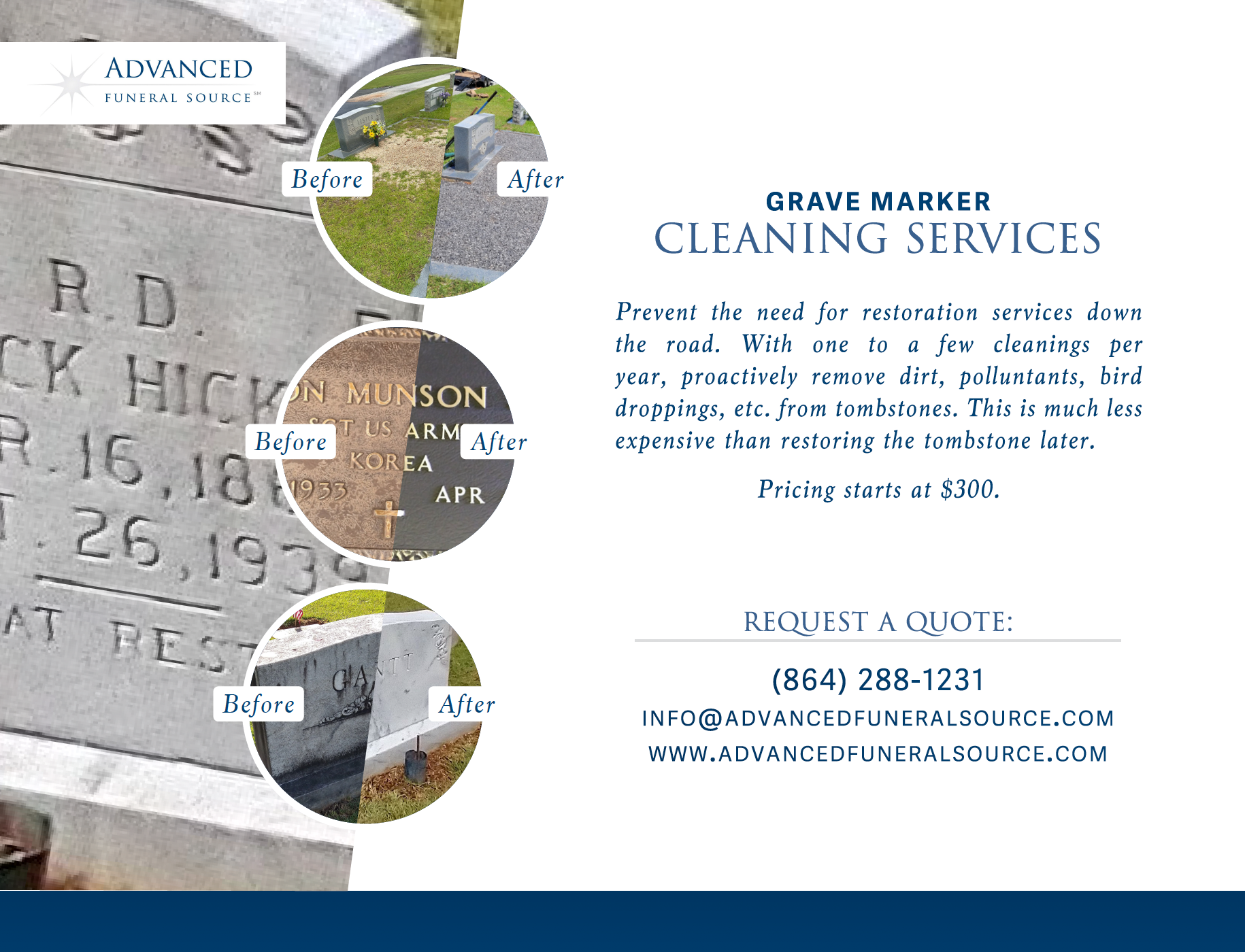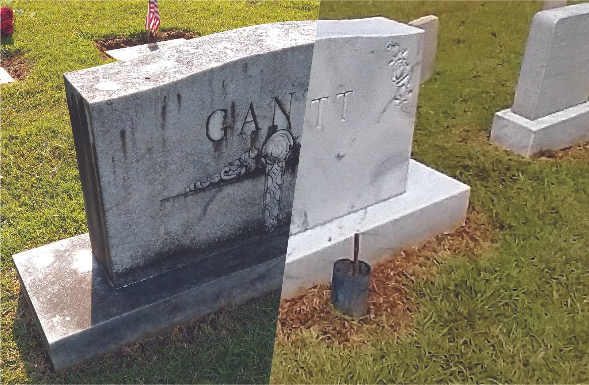 Prevent the need for restoration services down the road. From one to a few cleanings per year, proactively removing dirt, pollutants, bird droppings, etc. from tombstones is much less expensive than restoring the tombstone later.